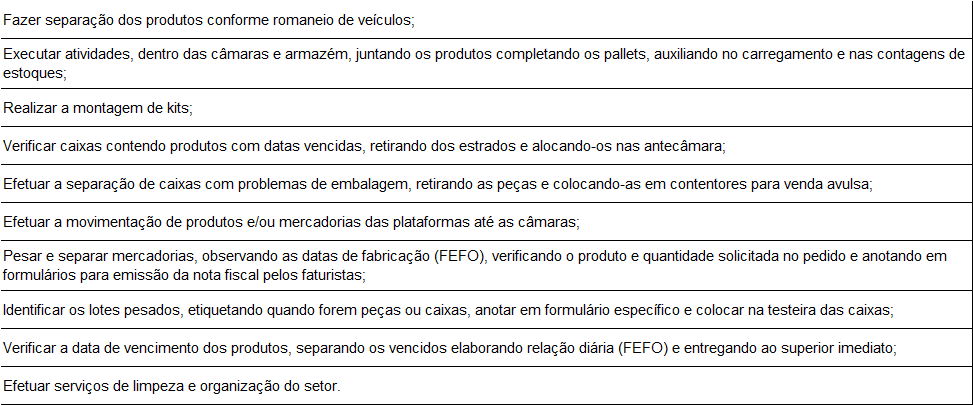 Executar serviços no armazém, efetuando carga e descarga de produtos nos veículos, movimentando produtos das plataformas até as câmaras, efetuar picking, bem como arrumar e empilhar produtos.